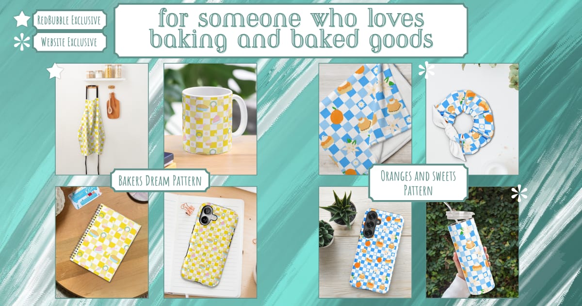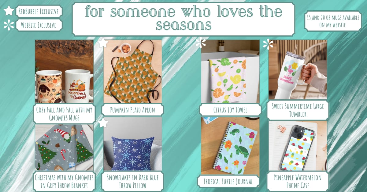 I think I am most proud of my seasonal patterns! They fit for anyone who is obsessed with a specific season. On my website, the Summer Time Collection features a couple exclusive items like towels and bathing suits. I absolutely loved my bathing suit! You can read my full review of my bathing suit in the blog post below. My website Summer Time Collection can be found here, Fall Collection here, and Winter Collection here. For RedBubble, you can find the Summer Time Collection here, Fall Collection here, and Winter Collection here.