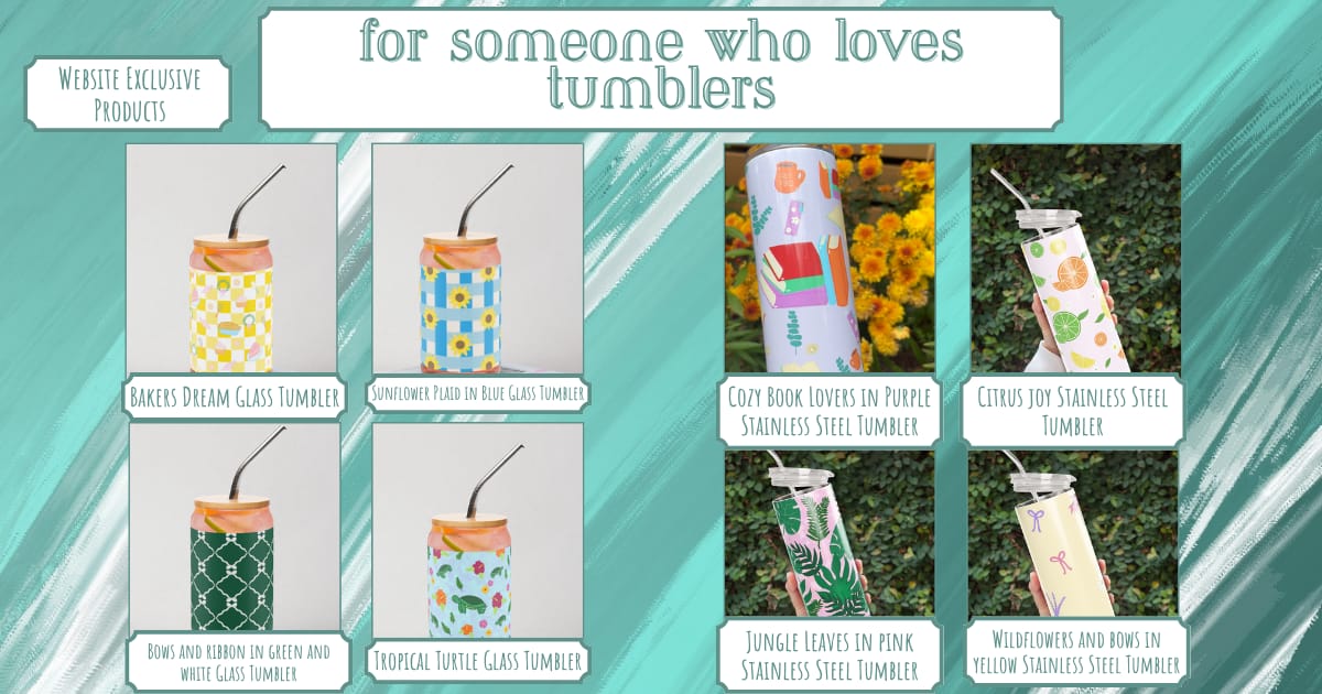 Scrunchies, glass tumblers, stainless steel tumblers, and 15-20oz mugs can be found exclusively on my website. I also offer towels for my Summer Time Pattern Collection.