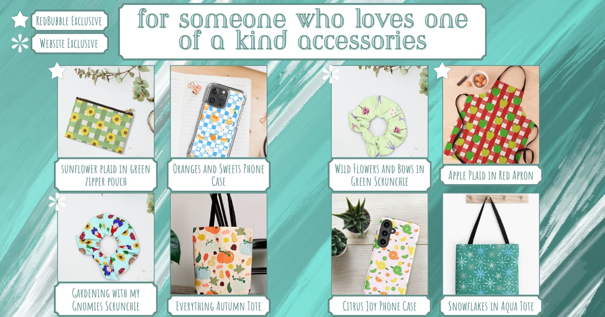 Both RedBubble and my website offer a variety of accessories! I personally love the scrunchies from my website. I use it weekly, and it hasn’t stretched out at all. Both my website and RedBubble offer phone cases, although I did not put my Winter Collection on the phone cases on my website. I realized I was basically doing double the work. 🤦♀️RedBubble offers a couple unique accessory items like zipper pouches, aprons, and various office items like mouse pads and laptop cases. Shop accessories on my website here and phone cases here. For RedBubble, accessories can be found here, phone cases here, and office items here.