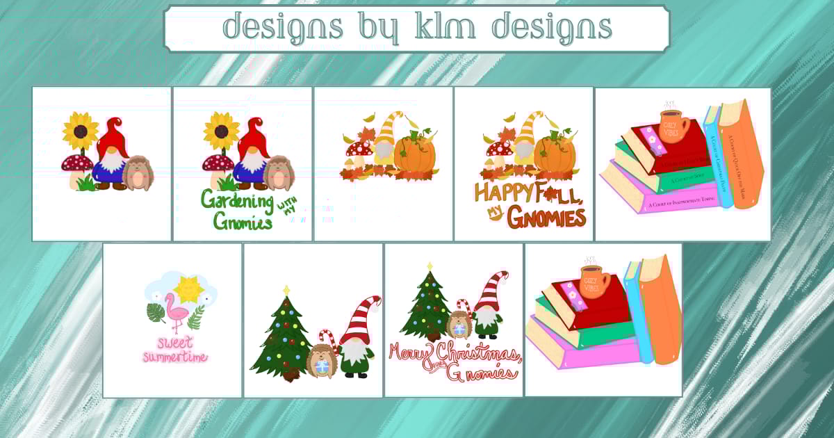 Here is my collection of designs that are available for purchase! All of the designs can be found on drinkware and shirts, and stickers can be purchased on RedBubble. See the list below for the names of the designs starting at the top left and going across the rows.