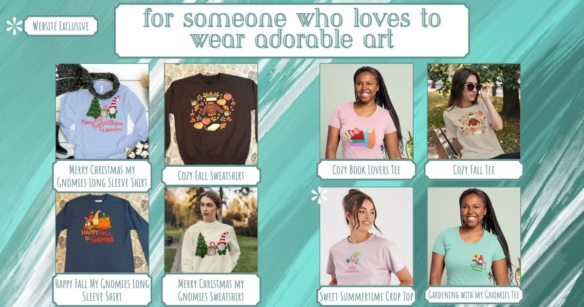 I have SO much fun wearing my art on clothing. Mainly because my kids will recognize that it’s my art and say how cool it is. On my website I offer Bella+Canvas short sleeve tees and Gildan long sleeve tees, as well as sweatshirts. The Cozy Book Lovers and Gardening with my Gnomies designs can be purchased on hoodies on my website as well. Find all my website apparel here.