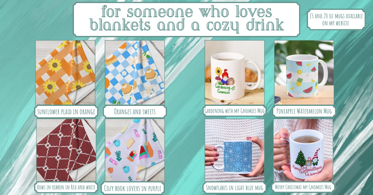 Throw blankets are offered in a variety of sizes and patterns on both RedBubble and my website. Both places offer sizes 50”x60” and 60”x80.” RedBubble also offers a smaller version measuring 40”x30.”
